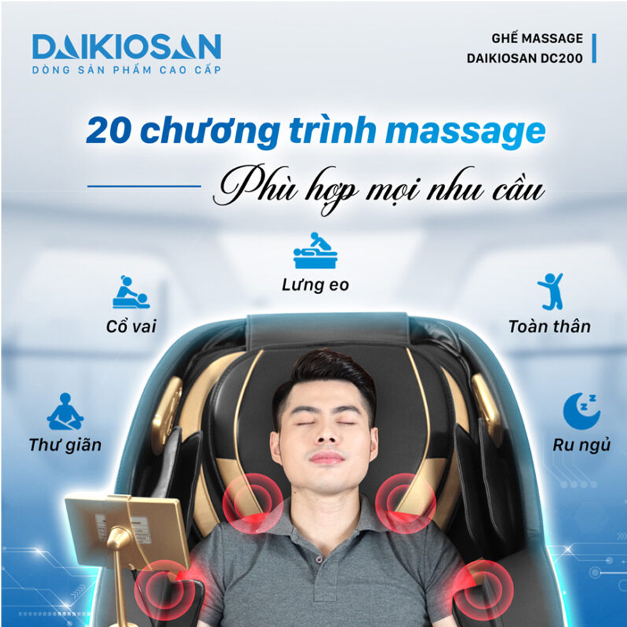 - Bao gồm 5 chế độ: Thư giãn, Cổ vai, Lưng eo, Toàn thân, Ru ngủ. Mỗi chế độ có 4 chương trình massage khác nhau.